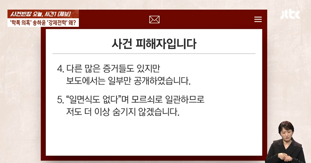 지난 화요일(2일) 저녁에 방송된 <사건반장>을 본다면 피해자는 추가 증거 자료를 갖고 있는 것으로 보인다. 더욱이 피해자만 아니라 다른 인물과 인터뷰를 했을 때도 모두 한결 같이 일관된 진술을 하고 있어 신빙성이 확보된 상태다. 이 정도면 "내 기억과 다르다. 사실무근이다."라고 말하는 송하윤이 문제일 가능성이 높아 보인다.