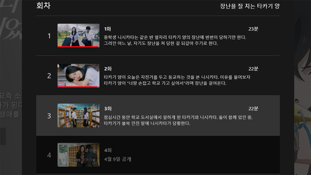 지난 화요일(2일)을 맞아 공개된 넷플릭스 드라마 <장난을 잘 치는 타카기 양 3화>는 도서 위원을 맡은 타카기와 니시카타 두 사람이 도서관에서 함께 시간을 보내는 모습을 그렸다. 타카기의 제안으로 서로에게 추천하고 싶은 책을 선택해 교환한 이후 책을 읽으면서 타카기가 책을 읽다가 장난을 치는 모습이 귀여워서 입꼬리가 올라갔다.