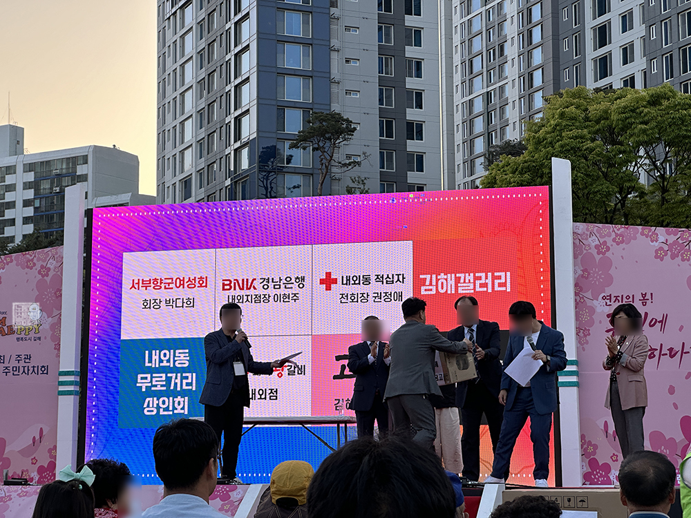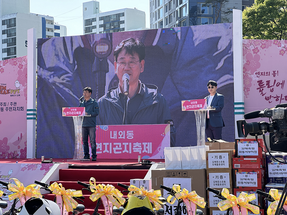 제2회 내외동 연지곤지축제를 축하하기 위해서 홍태용 김해 시장을 비롯해 지난 제22대 총선에서 당선된 김정호 국회의원, 그리고 류명렬 시의회 의장 등의 인사가 무대에 올라 간단히 축하를 건넸다. 무대 앞의 모습을 본다면 이번 제2회 연지곤지축제를 준비하는 과정에서 협력을 해준 기업과 단체에서 기증된 물품을 볼 수 있다.