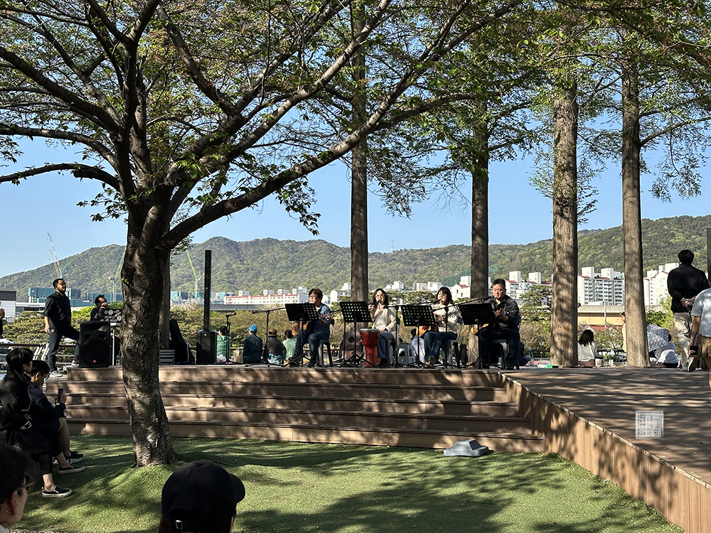 그리고 이번 제2회 내외동 연지곤지축제는 시계탑 근처에 마련된 본 무대만 아니라 작은 무대가 두 곳 더 설치되어 사람들이 즐길 수 있는 무대가 운영되었다. 가로수 나무와 연지호수를 배경으로 한 작은 무대에서는 다양한 팀의 버스킹 공연이 진행되면서 사람들의 발걸음을 멈추게 했다. 이런 날씨에는 버스킹 공연이 잘 어울렸다.