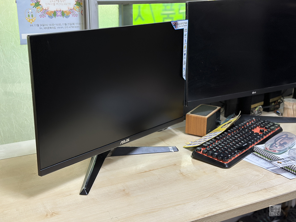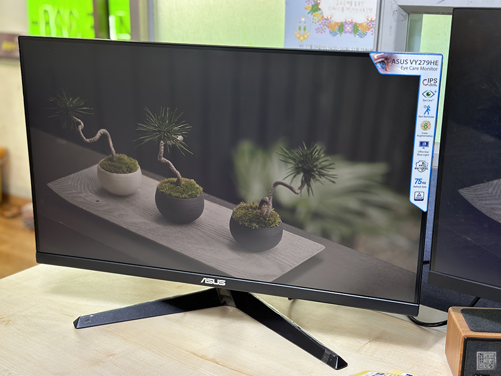 높이가 낮은 게 흠이다 보니 같은 높이로 모니터를 사용하려고 한다면 모니터 받침대가 필수적으로 필요하다. 하지만 이렇게 사무실 책상 한쪽에 설치를 해두니 나쁘지 않았다. ASUS VY279HE 모델은 IPS 패널이 적용되어 광시야각 상하좌우 178도를 지원하는 데다가 시력 보호 기술 로우 블루라이트(약 70% 감소) 기술도 적용되어 있다.