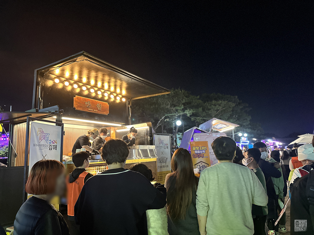 대신 당일 오후 7시부터 선착순으로 배부한 김해 뒷고기 무료 시식 행사에 참여하기 위한 줄을 서서 뒷고기와 맥주 한 잔을 받아서 먹었다. 뒷고기는 약 7~8조각 정도 들어가 있는 작은 컵으로 받을 수 있었는데, 소금 간이 되어 있어서 뒷고기가 자랑하는 쫄깃쫄깃한 식감을 즐길 수 있었다. 여기에 행사장의 음악이 더해지니 금상첨화였다.