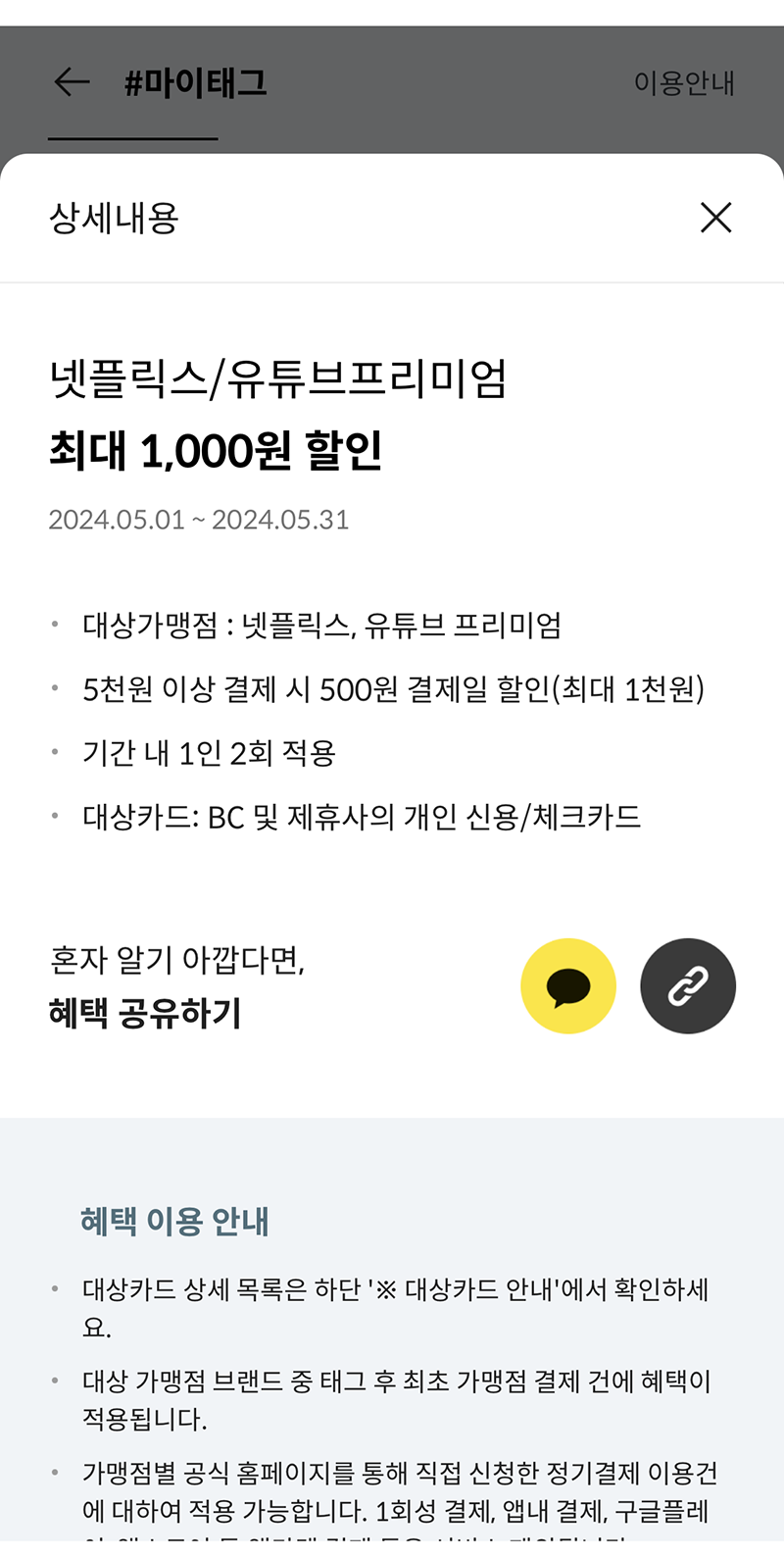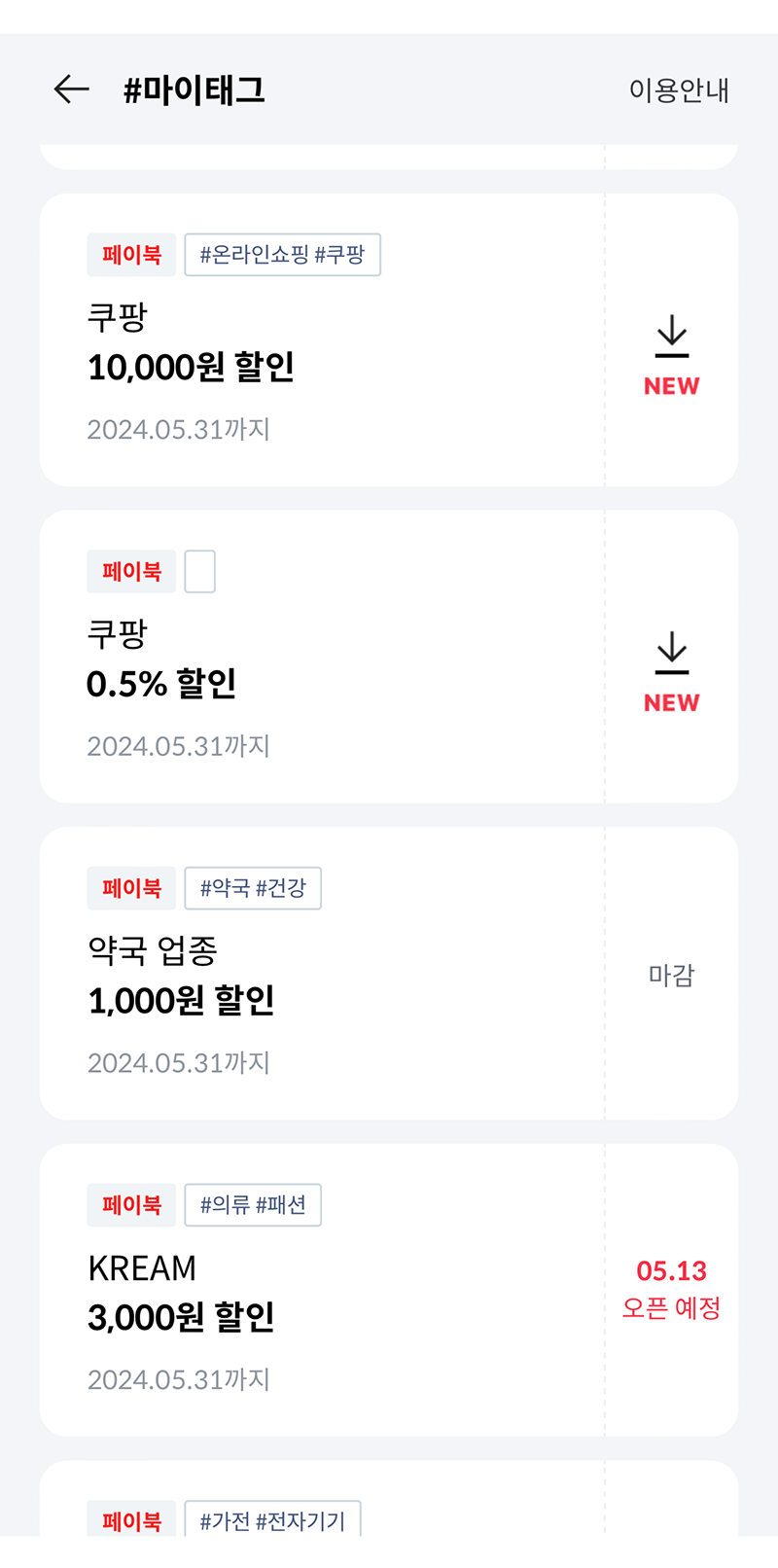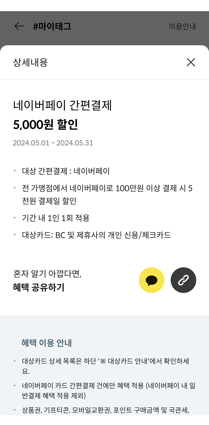 그리고 평소 자주 이용하는 네이버와 쿠팡의 5천 원 할인과 1만 원 할인도 마이태그 할인 혜택을 받고 싶었는데, 두 개의 할인 혜택 모두 100만 원 이상 결제 시 결제일에 할인이 되는 요구 조건이 있다 보니 사실 이용하기가 어려웠다. 물론, 5월을 맞아 100만 원 이상 결제를 할 경우가 있으면 몰라도… 그렇지 않으면 의미가 없었다.
