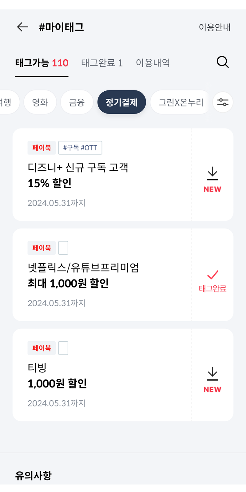 5월 1일이 된 이후 나는 페이북에 접속해 5월에 받을 수 있는 여러 할인 혜택을 태그 하기 위해 서둘렀다. 개인적으로 가장 서둘렀던 태그는 수량이 한정되어 있는 넷플릭스와 유튜브 프리미엄 할인 마이태그다. 지난 4월까지는 분명히 넷플릭스와 유튜브 프리미엄만 할인이 되었는데… 5월에는 티빙과 디즈니+가 추가되어 있었다.