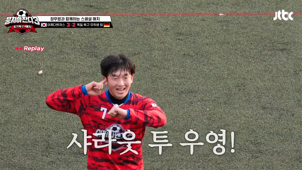 그런 정우영이 <뭉쳐야찬다3> 출연 소식은 국내 축구 팬들만 아니라 어쩌다벤져스 멤버들도 흥분을 감추지 못했다. <뭉쳐야찬다3 29회>에 출연한 정우영은 어쩌다벤져스에게 1:1 공격 훈련과 함께 칩슛의 요령을 이준이에게 맞춤 강의 형태로 가르쳐 주었다. 그렇게 배운 칩슛을 그 경기에서 볼 수 있을 줄은 미처 생각하지 못했다.