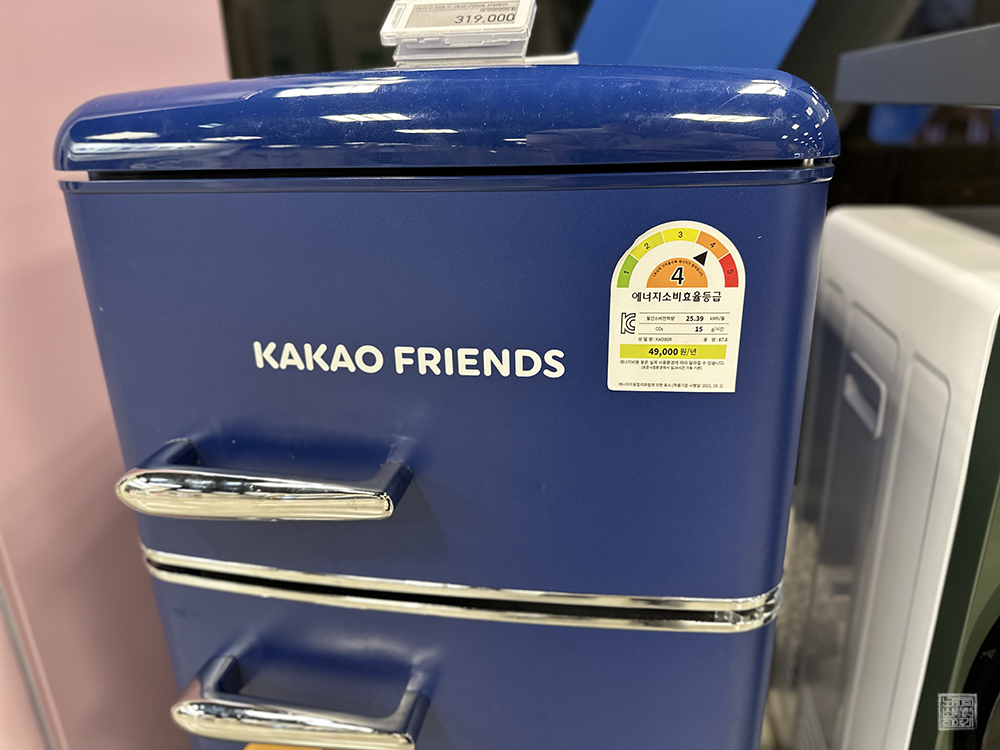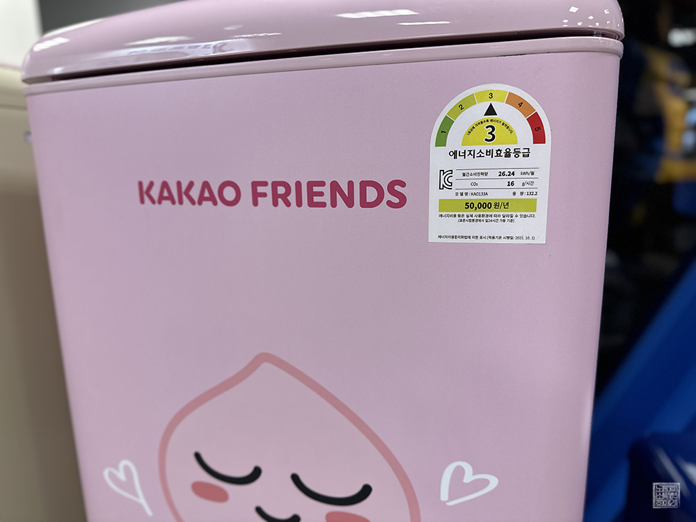냉장고에 붙은 에너비 소비 효율 등급을 본다면 1년 정도 냉장고를 사용했을 때 나오는 전기세가 간단히 정리되어 있다. 파란색 라이언 모델인 80L 냉장고는 1년에 약 49,000원이고, 베이지색 라이언과 핑크색 어피치가 모델인 133L 냉장고는 1년에 약 50,000원의 전기세가 나온다고 한다. 큰 차이는 없지만 용량 차이가 있으니 참고하자.