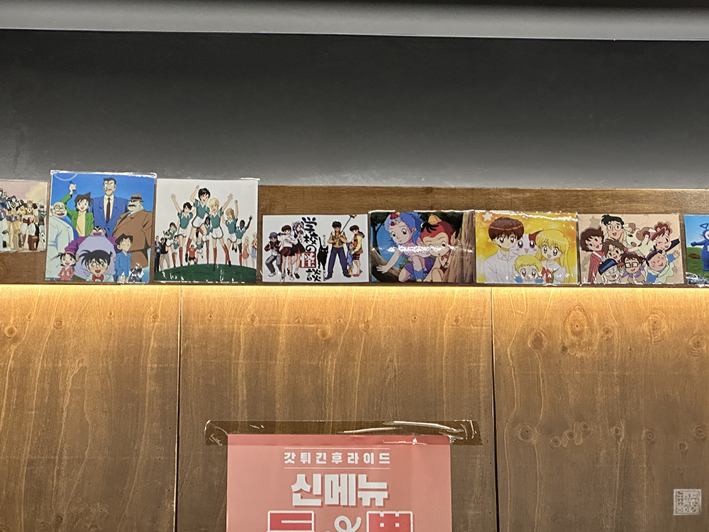 어제 나는 부처님 오신 날을 맞아 열심히 절을 다녀온 이후 워낙 지친 탓에 저녁은 맛있는 치킨을 먹고 싶었다. 그래서 자전거를 타고 갓튀긴후라이드 내외점을 찾아 치킨 포장 주문을 했는데, 가게 내부를 본다면 손님을 맞이할 수 있는 테이블도 잘 갖추고 있다. 개인적으로 눈길이 간 건 가게 내부에 장식된 여러 애니메이션 일러 카드다.