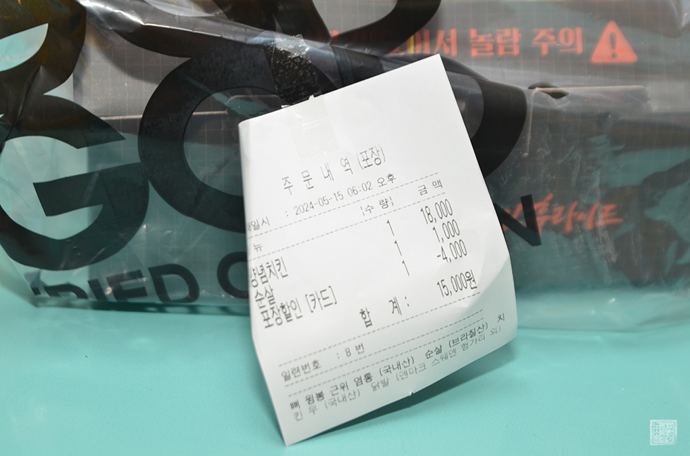 어쨌든, 그렇게 갓튀긴후라이드에서 양념치킨 순살 한 마리를 포장해서 집으로 가져왔다. 양념치킨 순살 한 마리 가격은 방문 포장 4천 원 할인을 받아서 15,000원으로, 이 가격 할인은 특정 요일에만 받을 수 있는 게 아니라 방문 포장으로 가게를 이용할 경우 항시 받을 수 있는 할인이라는 점이 무척 매력적이었다.
