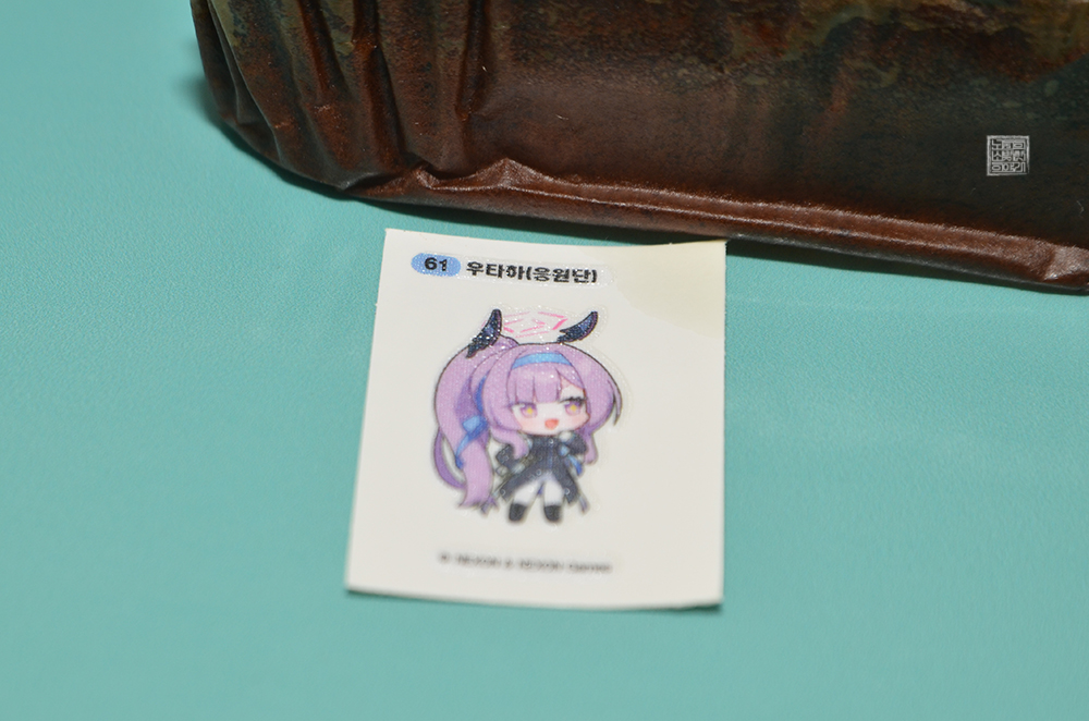 그리고 빵의 모습을 열어본다면 상당히 꾸덕한 느낌의 초코 파운드케익을 만날 수 있다. 블루 아카이브 빵을 열심히 구매하는 덕후들이 노리는 아이템 중 하나는 바로 빵에 들어 있는 블루 아카이브 띠부실이다. 사진에서 볼 수 있는 띠부실의 포장 상태를 본다면 빵의 기름…? 때문에 어떤 캐릭터가 있는지 눈으로 쉽게 확인할 수 있었다.