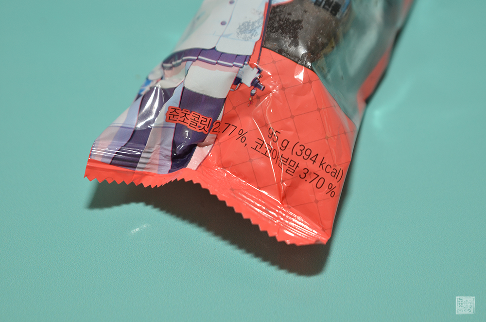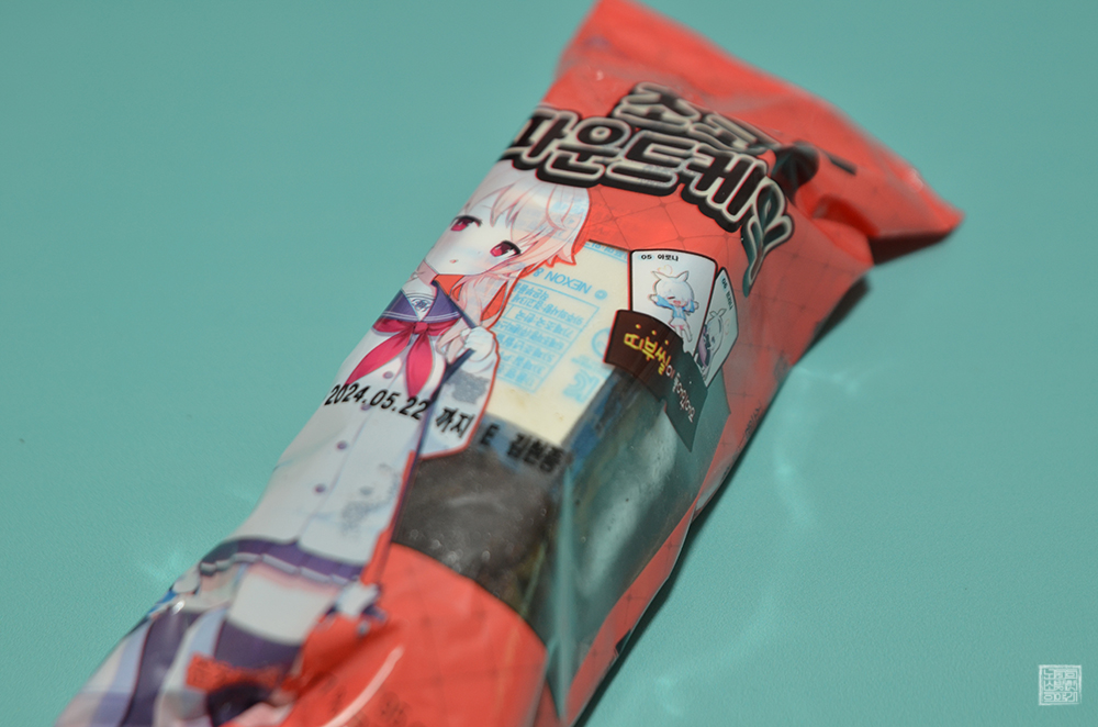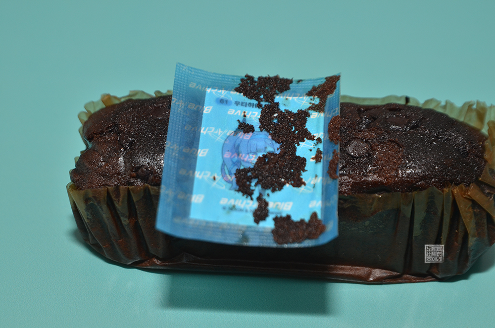 그리고 빵의 모습을 열어본다면 상당히 꾸덕한 느낌의 초코 파운드케익을 만날 수 있다. 블루 아카이브 빵을 열심히 구매하는 덕후들이 노리는 아이템 중 하나는 바로 빵에 들어 있는 블루 아카이브 띠부실이다. 사진에서 볼 수 있는 띠부실의 포장 상태를 본다면 빵의 기름…? 때문에 어떤 캐릭터가 있는지 눈으로 쉽게 확인할 수 있었다.