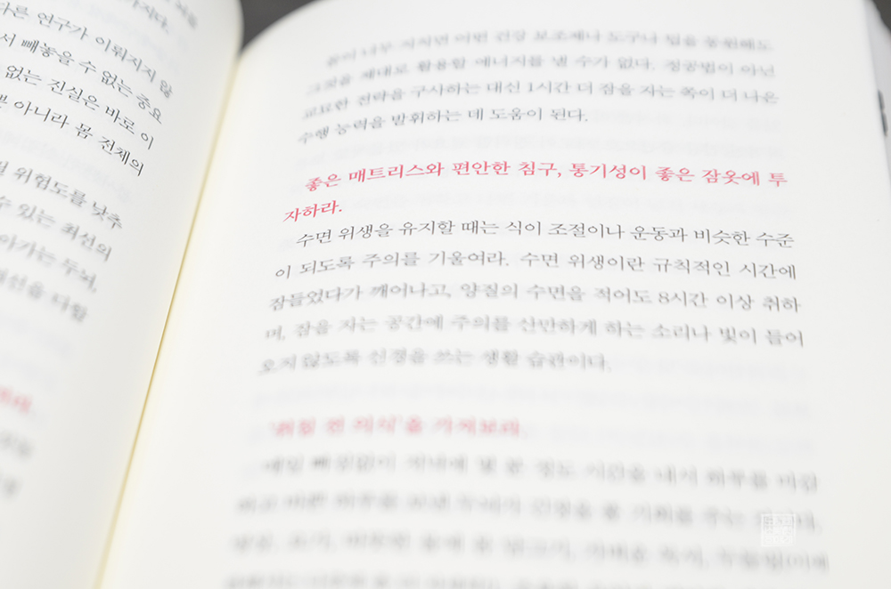 우선 밤에 숙면을 취하는 것부터 시작하라. 숙면은 모든 것의 기초다. 잠을 자지 않으면 에너지를 얻을 수가 없고, 뇌는 다른 어떤 것에도 주의를 집중할 수가 없다. 특히 자주 낮잠을 자는 것은 승수 효과를 낸다. 일상에서의 수행 능력을 올려주거나 반대로 완전히 망가뜨릴 수 있는 촉매 역할을 할 수 있다는 의미다. 수면이 얼마나 중요한지 인식하고, 알았으면 거기에 걸맞게 대우하라. 수면이 부족하면 에너지 레벨은 물론 실제로 신경계에 문제가 생기고 언젠가 그 값을 치러야 할 것이다. (본문 244)