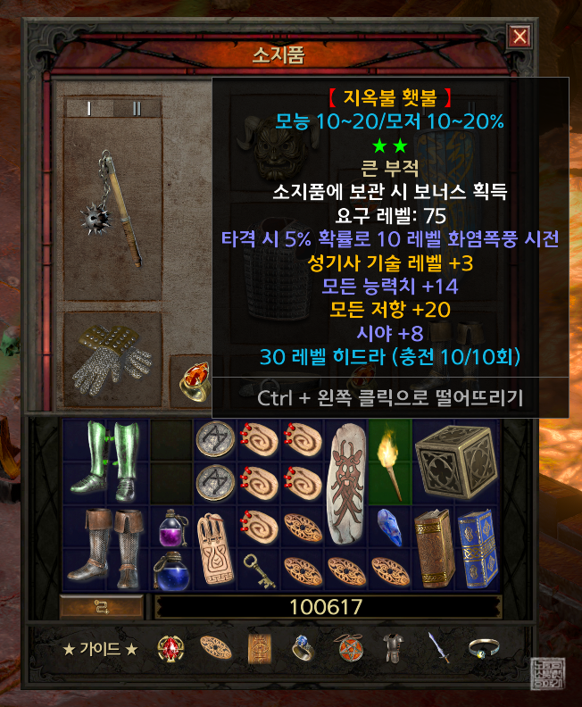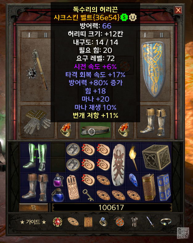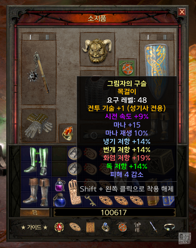 그래도 한 가지 아쉬운 점이 있다면 목걸이는 '전투 기술 +1'이 아니라 '전투 기술 +2'였으면 한다는 것, 그리고 벨트는 '시전 속도 +6%'가 아니라 '시전 속도 +10%'였으면 한다는 점이다. 그래도 1인방을 기준으로 사용하는 데에는 딱히 불편함이 없었다. 애초에 팔라딘은 시전 속도를 +105%만 확보하면 충분하다고 말하니까.
