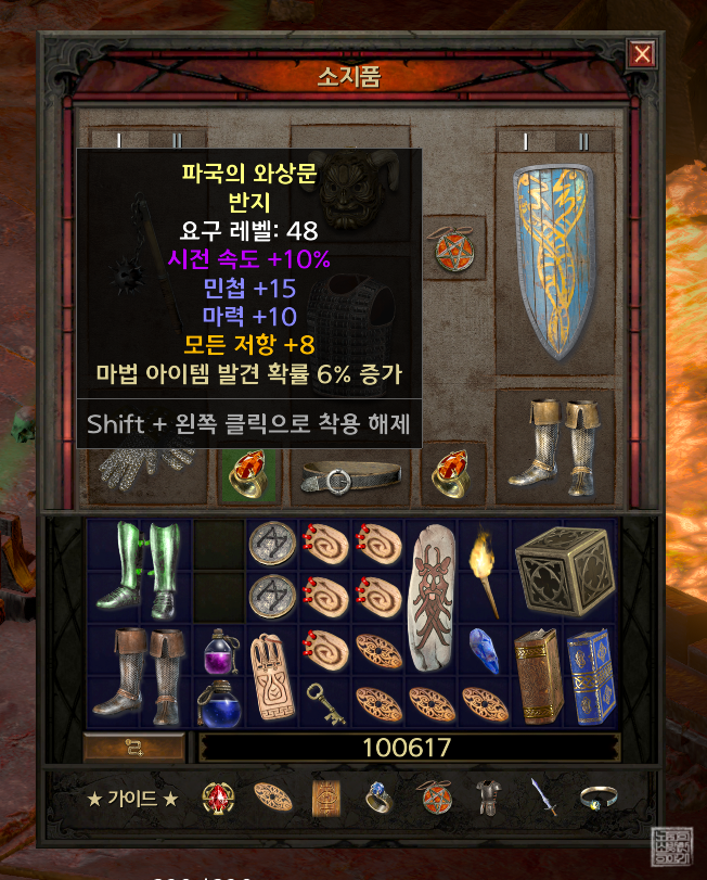 반지는 시전 속도가 중요하다 보니 초기에 구했던 반지 두 개를 아직 사용하고 있다. 더 좋은 옵션의 좋은 반지가 나오면 하는 바람도 있지만, 이 정도만 되어도 딱히 나쁘지 않게 사용할 수 있어서 크게 불만은 가지고 있지 않다. '파국의 와상문 반지'는 깨알 같은 모든 저항 +8 옵션과 매찬 6%가 붙은 것도 쏠쏠했고…. (웃음)