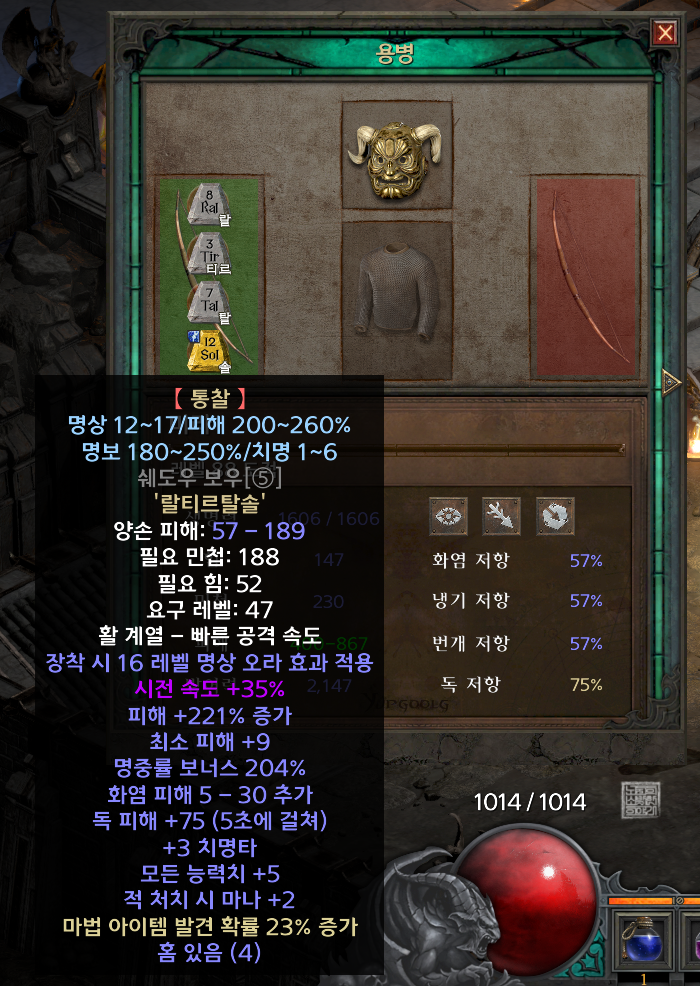 용병 같은 경우에는 방어력이 그렇게 높지는 않아도 획득한 에테리얼 3솟 갑옷에 투지를 만들어서 공격 속도를 확보해 주었고, 무기는 팔라딘이기 때문에 마력 보급을 위해서 통찰을 만들어주었다. 활 용병이기 때문에 투지와 통찰 세트만으로도 안정성을 상당히 확보할 수 있었고, 뚜껑은 국민 용병 투구가 된 치료 투구를 만들어주었다.