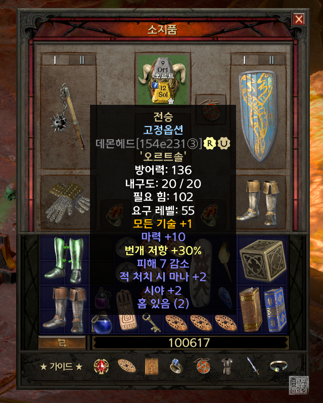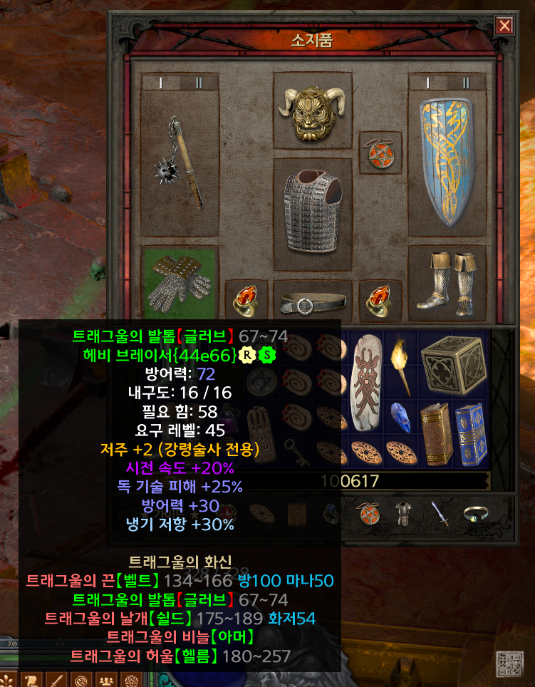 투구는 맨땅 플레이어의 국민 투구 중 하나인 전승(학식)을 만들어 주었고, 장갑은 아직까지 마수를 획득하지 못해 대체 아이템으로 유용한 트랑장― 트래그울의 발톱을 착용하고 있다. 트랑장은 마나 재생은 붙지 않아도 시전 속도 +20% 옵션과 함께 냉기 저항 +30% 옵션이 붙어 있기 때문에 맨땅 유저에게는 초기에 활용하기 좋았다.