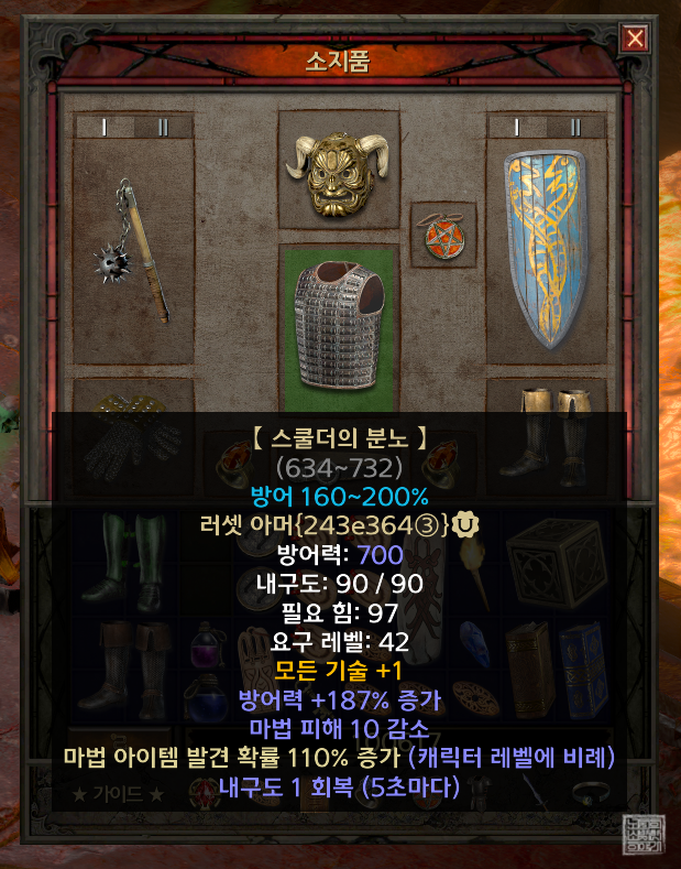 보통 초기에 고가 아이템을 획득하기 위해서 필요한 건 매직 아이템 찬스, 다시 말해서 위 사진에서 볼 수 있는 '마법 아이템 발견 확률'이 높아야 한다. 처음에는 매찬을 올릴 수 있는 아이템이 거의 없었기 때문에 매찬 32%로 시작했지만, 운 좋게도 '스쿨더의 분노' 러셋 아머를 획득해 매찬을 100% 이상 확보할 수 있게 되었다.