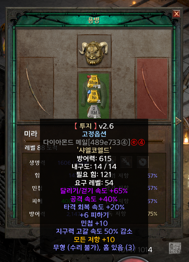 모든 저항 +45 옵션이 붙은 쿠라스트 쉴드는 소켓이 뚫리지 않은 상태로 나왔기 때문에 처음에는 라주크를 통해서 확정 4 소켓을 뚫을지 고민도 했었다. 하지만 초기에 룬워드 영혼을 제작하기 위해서 라주크를 한 차례 사용했다 보니 아까워서 큐빙으로 소켓을 뚫었다. 그 결과 4 소켓이 아니라 2 소켓이 나와서 각운을 제작했다.