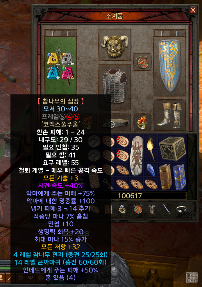 참나무의 심장은 모든 기술 +3 옵션과 함께 시전 속도 +40%, 그리고 모든 저항 30~40 옵션이 붙기 때문에 트랩 어새씬과 함께 팔라딘의 졸업 무기로 분류되는 룬워드다. 룬을 박아서 제작할 때 모든 저항 옵션이 30~40의 수치가 붙기 때문에 40에 가까워야 더욱 가치있기 마련인데, 아쉽게도 나는 저항 수치가 32에 불과했다.