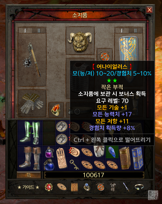 그리고 <디아블로2 레저렉션>을 하면서 사실상 캐릭터가 졸업을 했다고 말하기 위해서 필요한 아이템은 바로 위 사진에서 볼 수 있는 지옥불 횃불과 '애니참'으로 불리는 어나이얼러스 참이다. 두 개의 옵션을 본다면 모든 스킬과 함께 모든 능력치와 모든 저항을 올려주기 때문에 모든 캐릭터가 유용하게 활용할 수 있는 아이템이다.