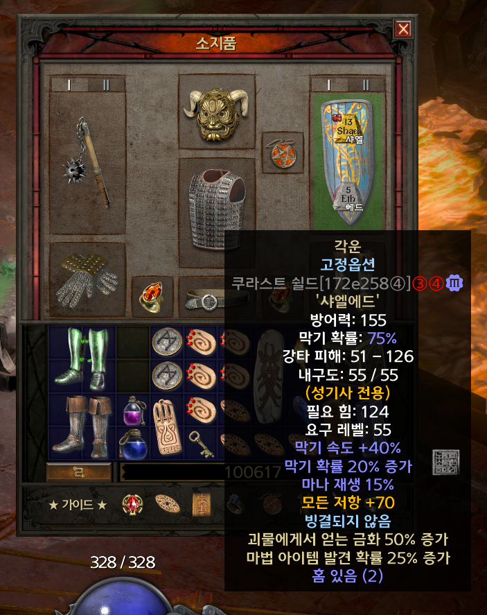 하지만 매찬이 100% 이상 되었다고 해도 고가 아이템이 그때부터 잘 떨어지는 건 아니다. 내가 키운 팔라딘은 레벨이 84를 넘어갈 때까지 제대로 된 방패를 구하지 못해 저렙 때 끼는 방패를 착용하고 있다가 겨우 위 사진에서 볼 수 있는 쿠라스트 쉴드를 손에 넣어서 각운을 만들 수 있었다. 와, 진짜 방패가 너무 안 나오는데?