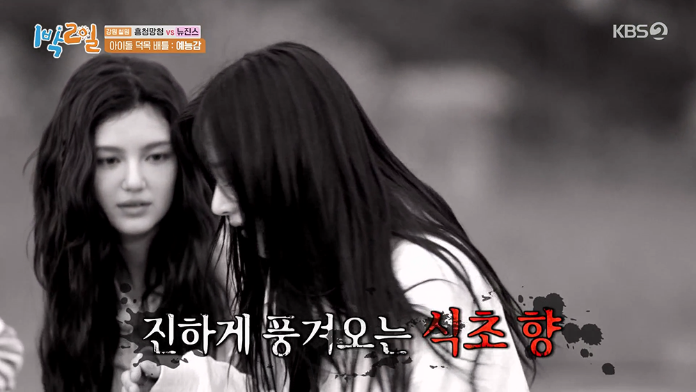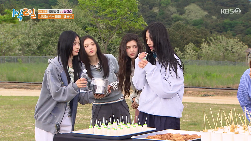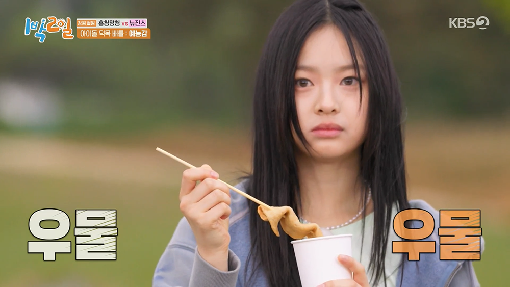 그리고 지난 <1박 2일> 뉴진스 편의 하이라이트는 바로 복불복이다. <1박 2일>의 정체성이라고 말할 수 있는 복불복은 뉴진스 멤버들에게도 가차 없었다. 당시 복불복 코스로 진행된 세 개의 음식은 식초를 탄 요구르트, 와사비를 넣은 붕어빵, 소금을 잔뜩 넣은 오뎅으로, 뉴진스 멤버들은 가히 톱 아이돌답게 변하지 않는 표정을 보여주었다.