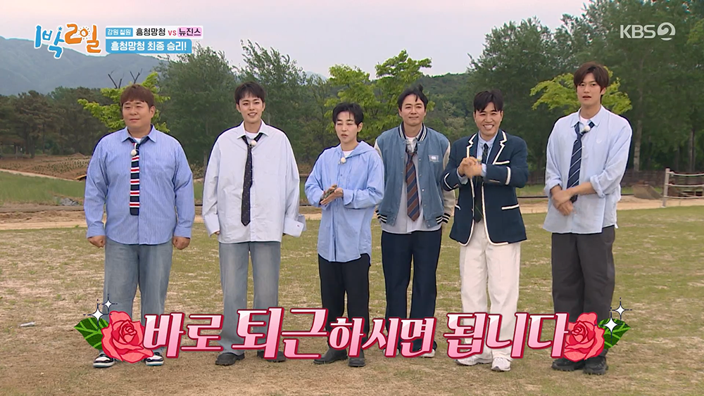 결과적으로 퇴근 미션에서 최종 승자는 <1박 2일> 멤버들이 되면서 뉴진스와 함께 기분 좋게 퇴근할 수 있었다. 만약 멤버들이 졌을 경우 PD가 말했던 찝찝한 퇴근은 어떤 퇴근이 되었을지 궁금했지만, 그런 궁금증보다 <1박 2일>에서 볼 수 있었던 뉴진스 멤버들이 보여준 오랜만의 상쾌하고 밝은 에너지가 더 좋았다고 생각한다. (웃음)
