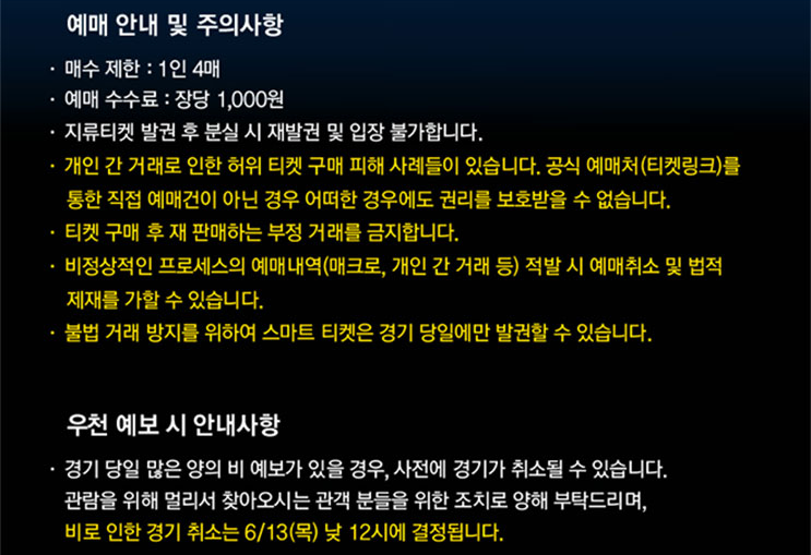 그리고 티켓링크 예매 페이지를 본다면 경기가 열리는 당일에 많은 비가 예고된다면 경기가 취소될 수 있다고 하는데, 이번 주말은 폭염주의보가 내릴 예정이라고 하니 비 걱정은 하지 않아도 될 것 같다. 만약 티켓링크 예매 페이지를 통해 직관 티켓을 손에 넣지 못했다면, 추후 JTBC 인스타그램 채널에서 진행하는 이벤트를 주목해 보자.
