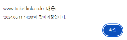 나도 오늘 오후 1시 40분부터 티켓링크의 최강야구 페이지에 들어가 대기를 하고 있었는데, 딱 오후 2시가 되기 전 약 10초 전부터 열심히 '예매하기' 버튼을 클릭했다. 하지만 오후 2시 2초가 되어도 여전히 '2024.06.11 14:00에 판매 예정입니다.'라는 안내 메시지만 나오자… 뭔가 잘못되었다 싶어서 새로고침을 한 이후 다시 버튼을 눌렀다.