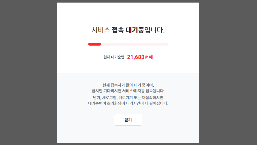 그 결과 내가 마주한 시스템 창은 '서비스 접속 대기 중입니다.'라는 메시지와 함께 무려 21,683번째라는 대기순번이었다. 예매하기 버튼을 오후 2시에 맞춰서 열심히 누르는 게 아니라 10초 전에 '새로고침'을 누른 이후 해당 페이지에서 예매하기 버튼을 눌렀어야 했는데 큰 실수를 해버리고 말았다. 사실상 티켓 예매에 실패했다고 생각한다.