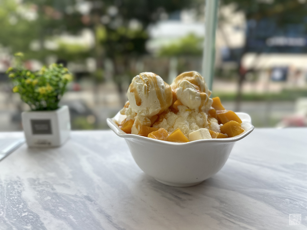 그렇게 창가 테이블에 앉아 바깥 풍경을 보거나 SNS 채널을 둘러보고 있었더니 마침내 주문한 망고 빙수가 나왔다. 카페에 들어오는 입구에서 볼 수 있었던 배너 이미지와 메뉴판 이미지에서는 아이스크림이 한 개 올려져 있었지만, 내가 받아본 망고 빙수에는 아이스크림이 두 개나 올려져 있었다. 이건 도대체 어떻게 된 일일까?