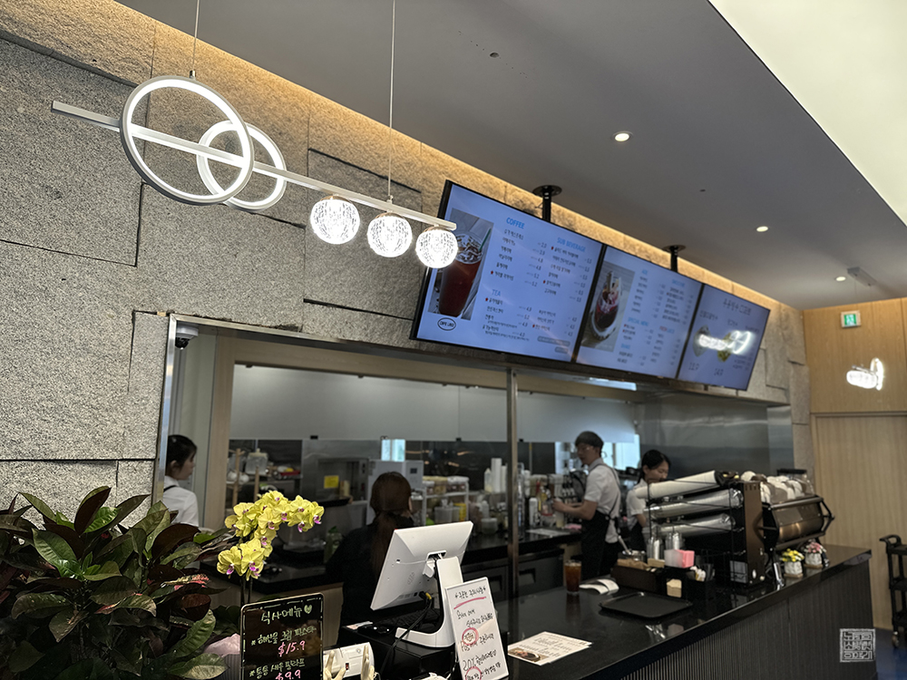 빵에 대한 욕심이 조금 있어도 나는 그 욕심을 적절히 조절한 이후 망고 빙수 하나만 주문하고 나서 창가 쪽에 자리를 잡았다. 창가에는 다이소에서 구매한 화분이 장식디어 있었고, 테이블 위의 커버를 열어 보니 위 사진처럼 220V 코드를 연결할 수 있는 포트와 LAN, USB 포트가 자리를 잡고 있었다. 이런 서비스가 갖춰진 것도 매력이었다.