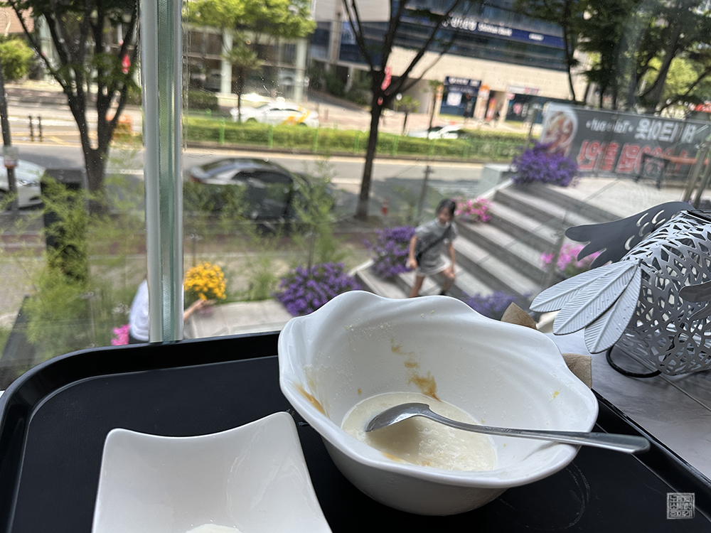 빙수 사진을 찍기 위해서 일부러 검은 쟁반에서 꺼내 테이블에 올려서 사진을 찍고, 빙수를 먹을 때는 함께 받았던 검은 쟁반 위에 올려서 빙수를 깔끔하게 먹었다. 아이스크림 위에 올려진 캐러멜 소스와 함께 치즈 큐빅, 망고와 우유 빙수가 적절히 섞여 시원하고 맛있게 먹을 수 있었다고 생각한다. 역시 여름에는 빙수가 최고다.