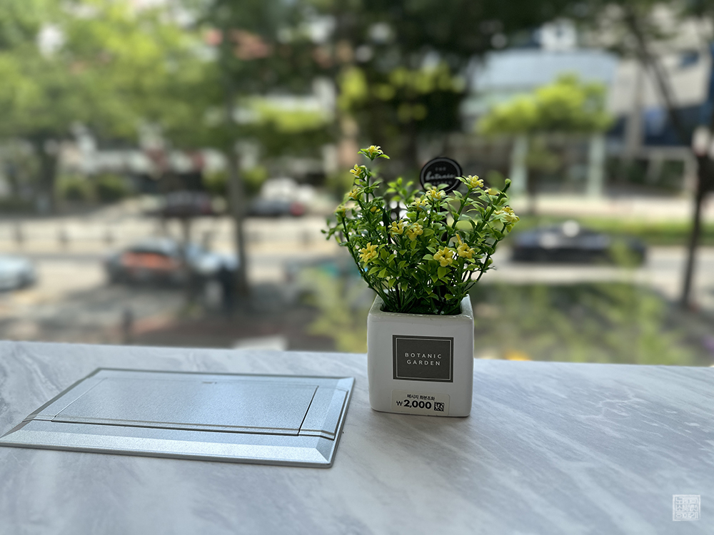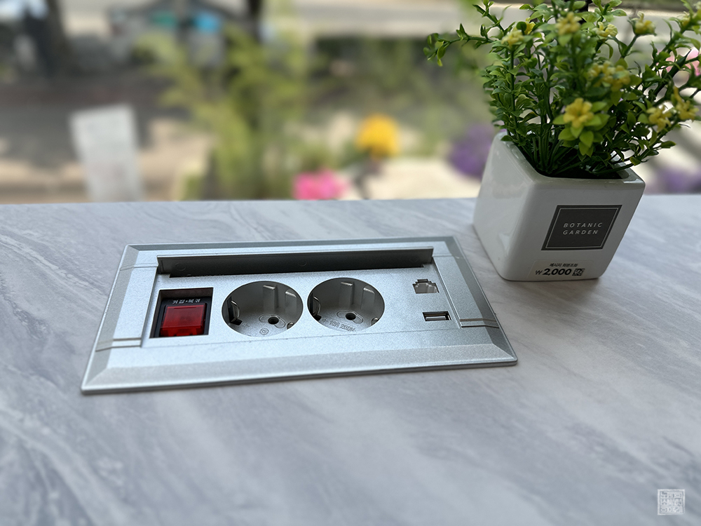 빵에 대한 욕심이 조금 있어도 나는 그 욕심을 적절히 조절한 이후 망고 빙수 하나만 주문하고 나서 창가 쪽에 자리를 잡았다. 창가에는 다이소에서 구매한 화분이 장식디어 있었고, 테이블 위의 커버를 열어 보니 위 사진처럼 220V 코드를 연결할 수 있는 포트와 LAN, USB 포트가 자리를 잡고 있었다. 이런 서비스가 갖춰진 것도 매력이었다.