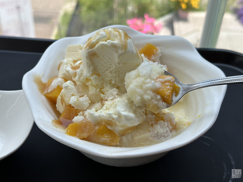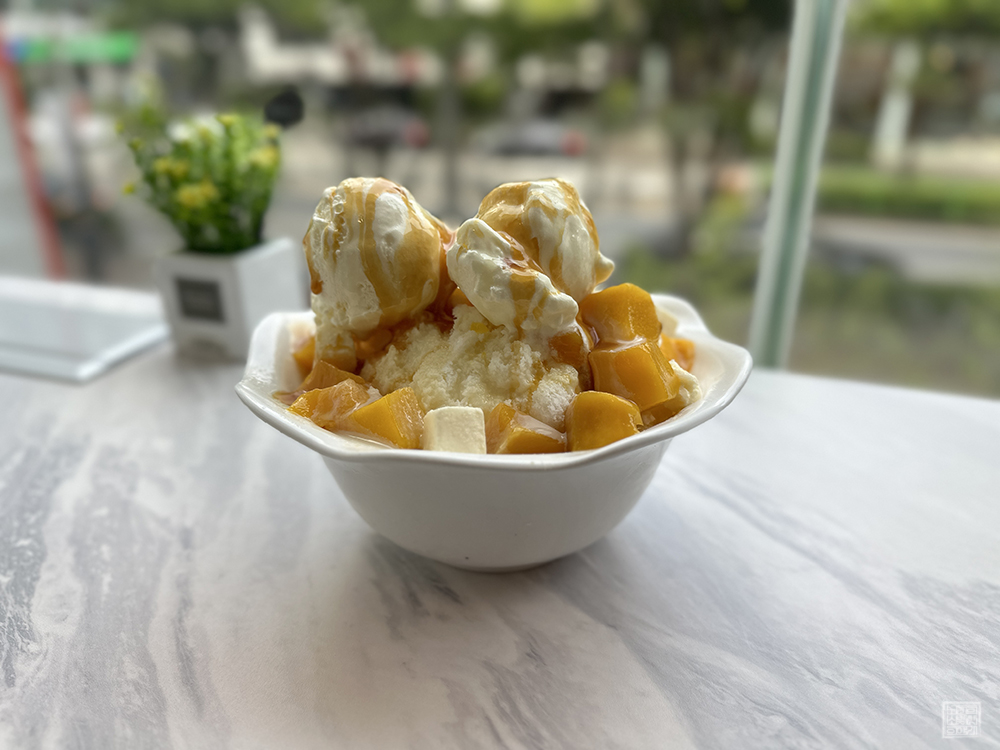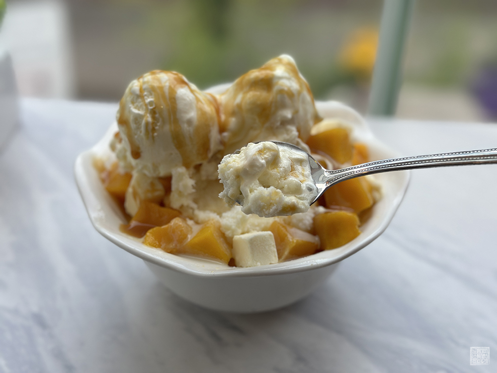 그렇게 창가 테이블에 앉아 바깥 풍경을 보거나 SNS 채널을 둘러보고 있었더니 마침내 주문한 망고 빙수가 나왔다. 카페에 들어오는 입구에서 볼 수 있었던 배너 이미지와 메뉴판 이미지에서는 아이스크림이 한 개 올려져 있었지만, 내가 받아본 망고 빙수에는 아이스크림이 두 개나 올려져 있었다. 이건 도대체 어떻게 된 일일까?