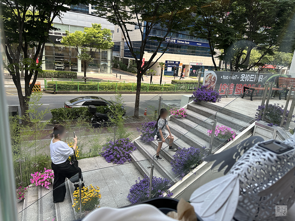 카페에 올라오는 계단도 꽃으로 잘 장식되어 있다 보니 창가에서 빙수를 먹고 있을 때 카페를 찾으면서 사진을 찍는 사람들의 모습을 종종 볼 수 있었다. 창가에 앉아 빙수를 먹거나 음료를 마시면서 바라볼 수 있는 풍경은 확 트인 풍경은 아니라고 해도 충분히 파란 하늘을 올려다볼 수 있고, 지나가는 사람들을 볼 수 있어 나쁘지 않았다.