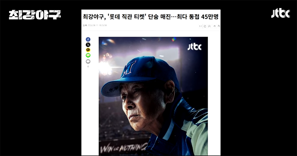 지난 일요일(16일)을 맞아 부산 사직구장에서 열렸던 최강야구 시즌 세 번째 직관 경기의 티켓 예매는 최다 동시 접속자 수가 45만 명에 육박할 정도로 화제가 되었다. 단순히 최강야구의 멤버들을 지방에서 볼 수 있다는 점만 아니라 팬덤이 뜨겁기로 유명한 부산 사직구장에서 열리다 보니 롯데 팬들도 크게 몰린 것으로 보였다.