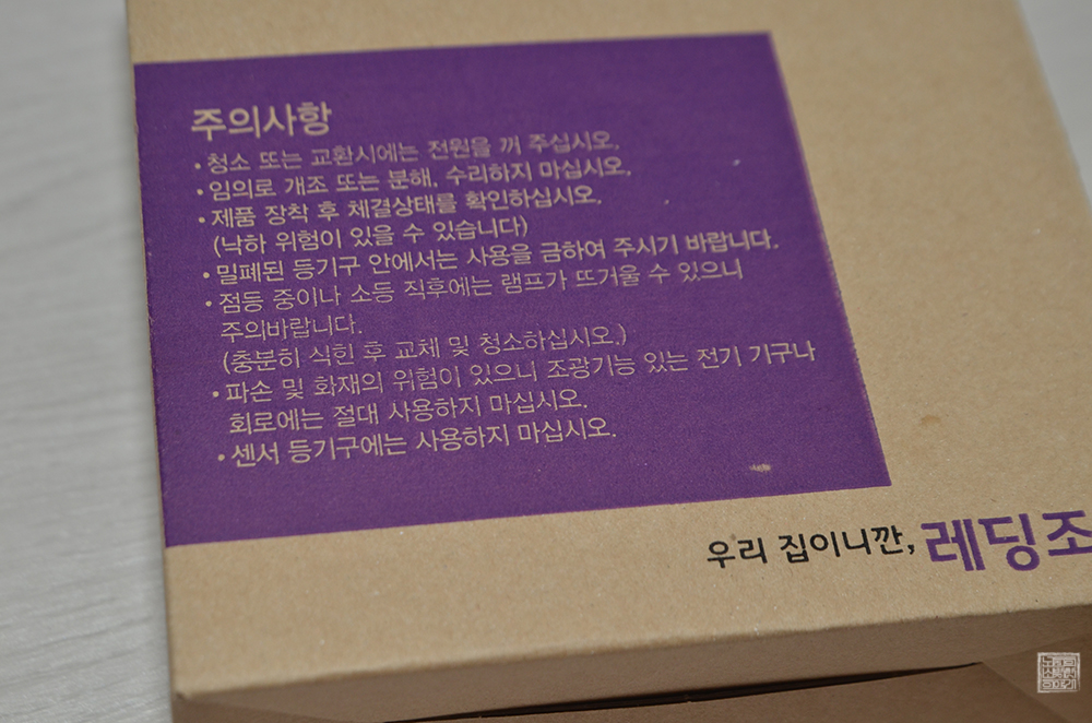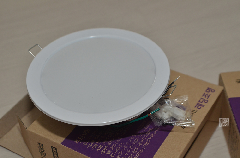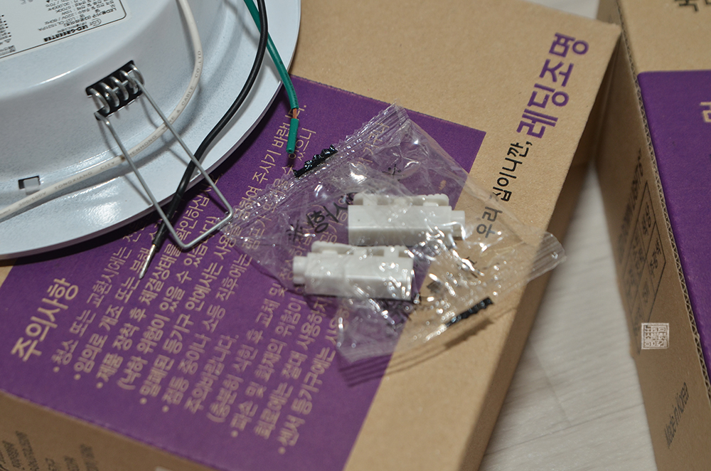 제품은 아주 단순하게 본품과 함께 전원선을 연결하기 위한 커넥터 두 개가 들어 있는 게 전부였다. 나는 해당 매입등의 전원선을 메인 전원선과 연결하는 방법을 설명한 설명서가 없다는 사실에 놀랐다. 보통 LED 전등이라고 해도 간단히 설명서가 있기 마련일 텐데… 글을 읽을 수 있는 건 상자에 표기된 주의사항 한 가지뿐이었다.
