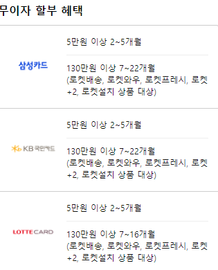이전까지 쿠팡에서는 사전 예매 페이지를 통해서 무이자 할부 혜택을 받을 수 있는 카드사를 따로 정리하고 있었지만, 이번에는 결제창에서 무이자 할부 혜택이 지원되는 카드를 확인해야만 했다. 기본적으로 위 사진에서 볼 수 있듯이 삼성카드와 KB 국민카드만 130만 원 이상 결제 시 최대 22개월 무이자 할부 혜택을 지원하고 있다.