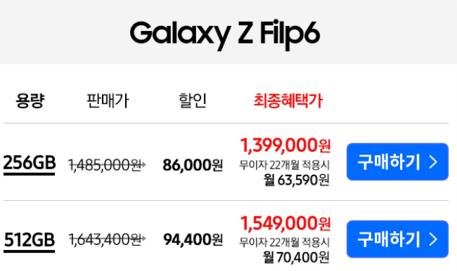 특히, 쿠팡에서는 최대 22개월 무이자 할부를 지원하기 때문에 256GB와 512GB 모델 둘 중 어느 것을 선택하더라도 월 7만 원의 금액으로 갤럭시 Z 플립6을 이용할 수 있다는 점이 매력적이다. 단, 최대 22개월 무이자 할부를 지원하는 카드는 오직 삼성카드와 KB국민카드 두 카드뿐이기에 결제할 때 주의가 필요해 보인다.