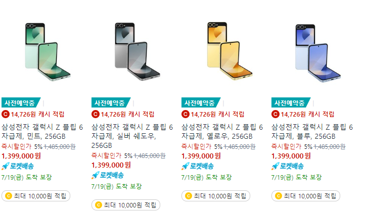 이렇게 카메라 기능만 놓고 보더라도 상당히 매력적인 갤럭시 Z 플립6은 256GB 모델을 기준으로 쿠팡에서 5% 즉시 할인을 받아서 약 139만 원에 구매할 수 있다. 그리고 512GB 모델을 기준으로 쿠팡에서 5% 즉시 할인을 받을 경우 약 154만 원에 구매할 수 있다 보니 자급제로 갤럭시 Z 플립6을 구매한다면 가장 저렴하다.