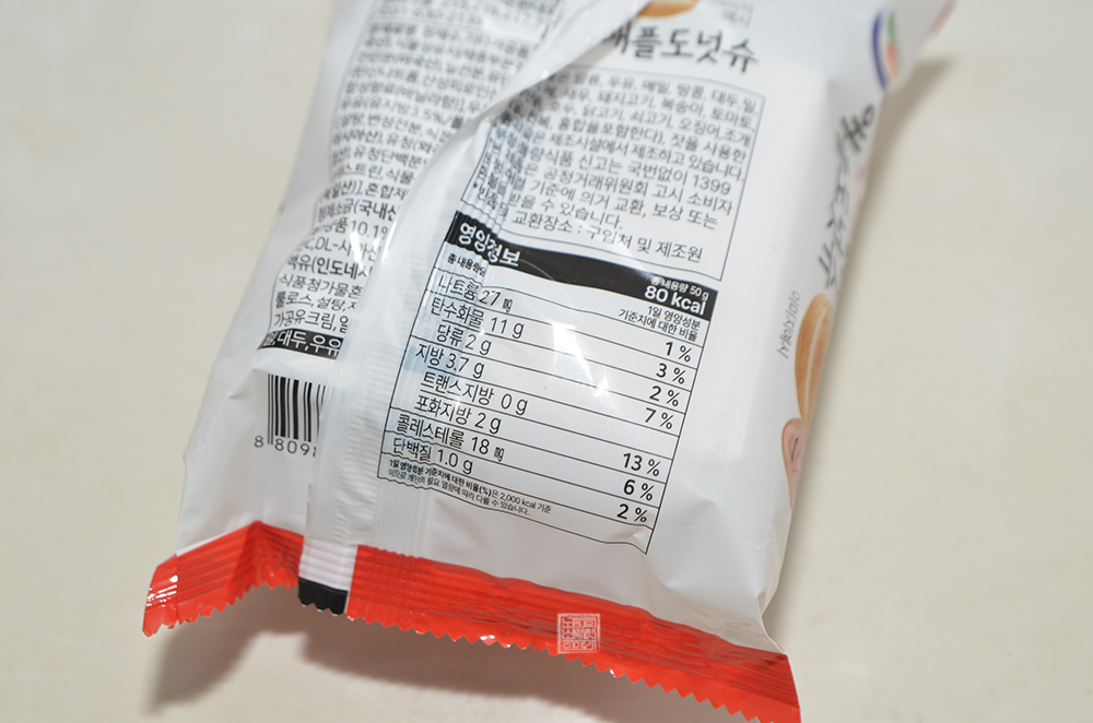 충주맨 애플도넛슈의 애플은 충주시에서 생산하는 사과로 알려져 있고, 충주맨 애플도넛슈의 칼로리는 80칼로리이기 때문에 높은 편은 아니었다. 간식으로 먹기 적당한 칼로리라고 말할 수 있는데… 편의점에서 판매하는 빵의 단점이라고 말할 수 있는 포화 지방의 비율이 높은 건 어쩔 수 없었다. 그래도 80칼로리이니까!
