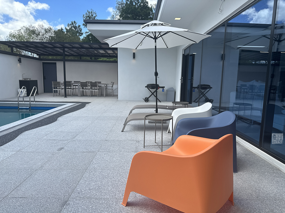 밝은 톤으로 되어 있는 거실과 소파는 밀양까지 찾은 여행의 피로를 풀기에 딱 안성맞춤이다. 하지만 풀빌라를 찾은 이유는 단순히 에어컨을 틀고 소파에 앉아 TV를 보는 게 아니라 집에서는 즐길 수 없는 물놀이를 즐기는 것에 목적이 있다. 밀양 풀빌라M은 거실에서 곧바로 수영장으로 나가서 차가운 물에 몸을 담글 수 있다.
