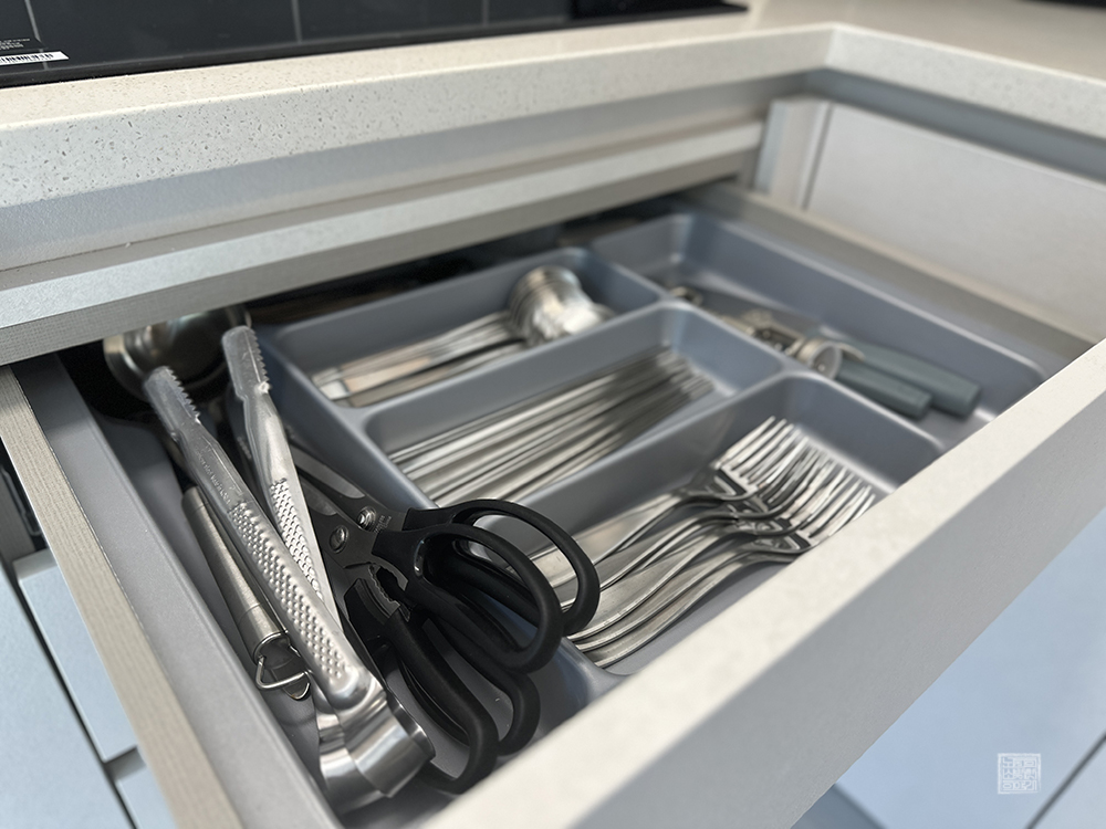 캡슐 커피 머신 옆은 싱크대도 잘 되어 있고, 싱크대 아래 수납장을 본다면 BBQ를 즐기기 위해 필요한 가위와 집게부터 시작해서 다양한 도구들이 잘 갖추어져 있다. 실내 부엌에서도 조리할 수 있는 밥통과 전자레인지, 인덕션이 잘 갖추어져 있지만, 수영장이 야외에서도 BBQ를 하기 위한 그릴과 함께 외부 식탁이 자리를 잡고 있다.
