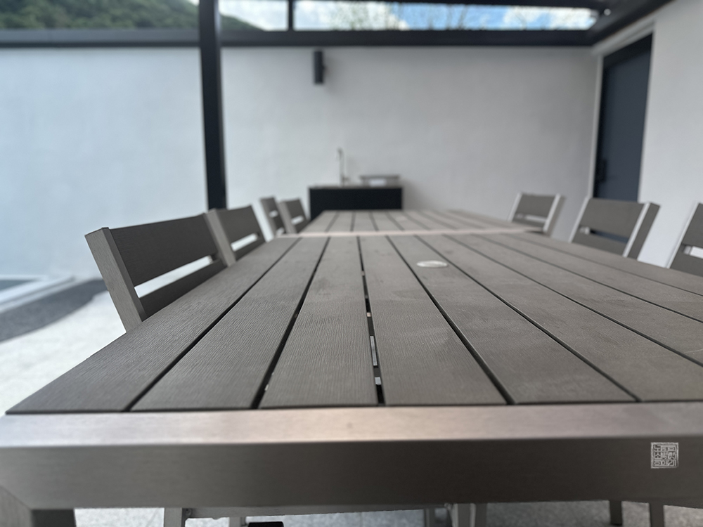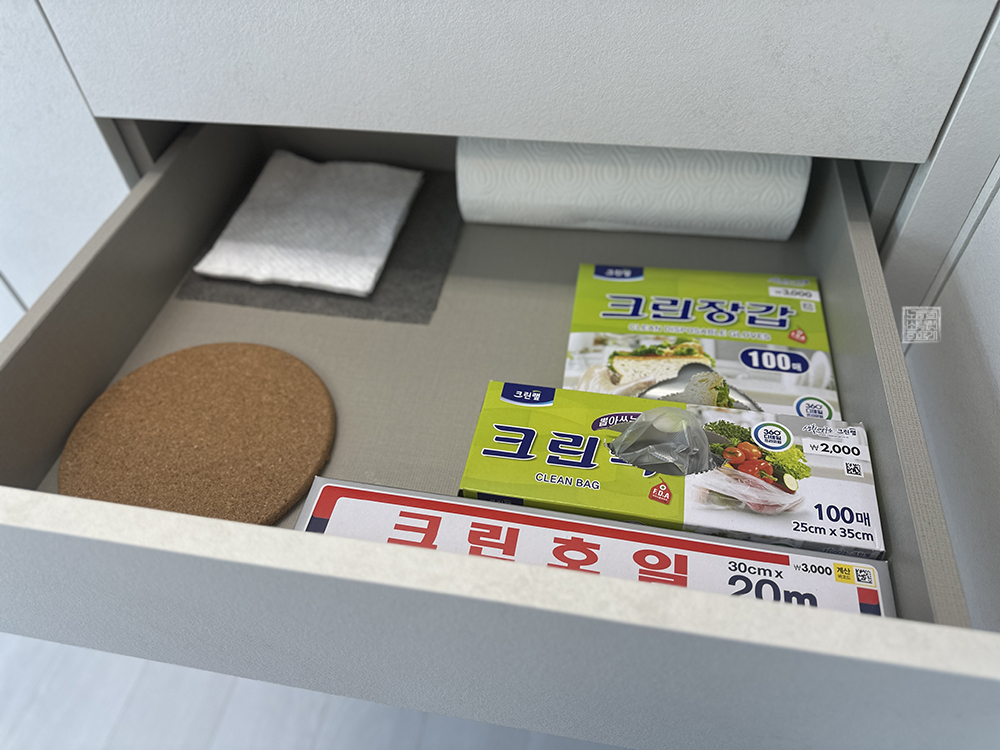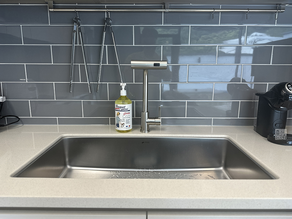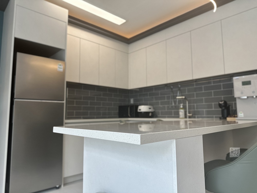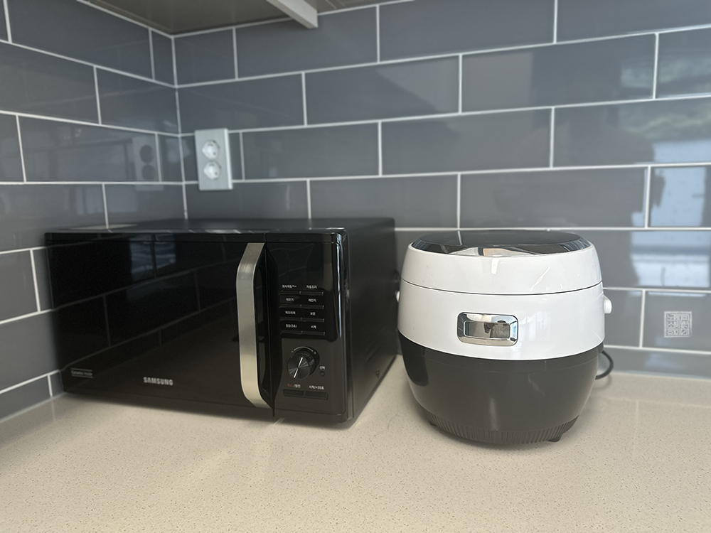 캡슐 커피 머신 옆은 싱크대도 잘 되어 있고, 싱크대 아래 수납장을 본다면 BBQ를 즐기기 위해 필요한 가위와 집게부터 시작해서 다양한 도구들이 잘 갖추어져 있다. 실내 부엌에서도 조리할 수 있는 밥통과 전자레인지, 인덕션이 잘 갖추어져 있지만, 수영장이 야외에서도 BBQ를 하기 위한 그릴과 함께 외부 식탁이 자리를 잡고 있다.