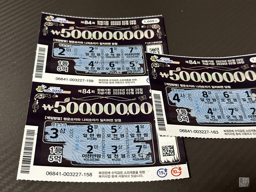 아쉽게도 내가 당첨된 건 1등 5억 원이 아니라 3등 1만 원이었다. 재미있는 점은 4천 원으로 구매한 스피또1000 제84회 복권 4장 중 3장이 3등 1만 원, 4등 5천 원, 5등 1천 원에 당첨되었다는 점이다. 1등 5억 원, 2등 2천 만 원을 빼놓고 당첨되었다는 게 우스웠는데, 제발 이번에는 1등 5억 원이 있기를 바라면서 복권을 교환해 왔다.