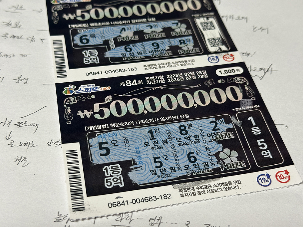 내가 즉석 복권을 구매하는 복권 판매점은 집에서 도보로 5분 거리에 있고, 지금까지 2등은 몇 번 나오기는 했어도 1등은 아직까지 나온 적이 없는 곳이다. 이제는 1등이 나올 때가 되었다고 생각하는데… 부디 매일 같이 꾸준히 복권을 구매&교환하는 내가 남아 있는 스피또1000 제84회 1등 5억 원에 당첨되었으면 하는 바람이다. (웃음)
