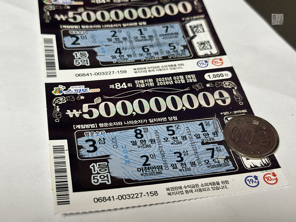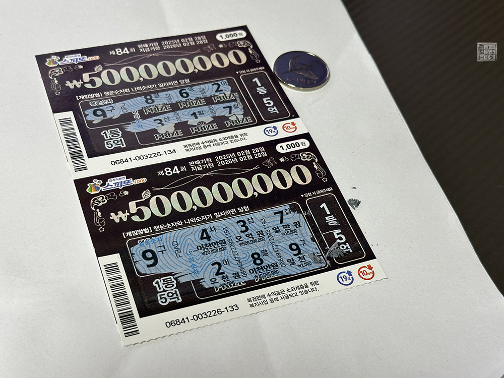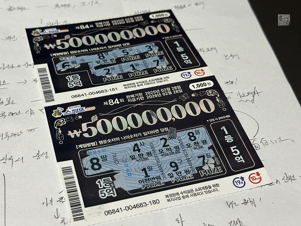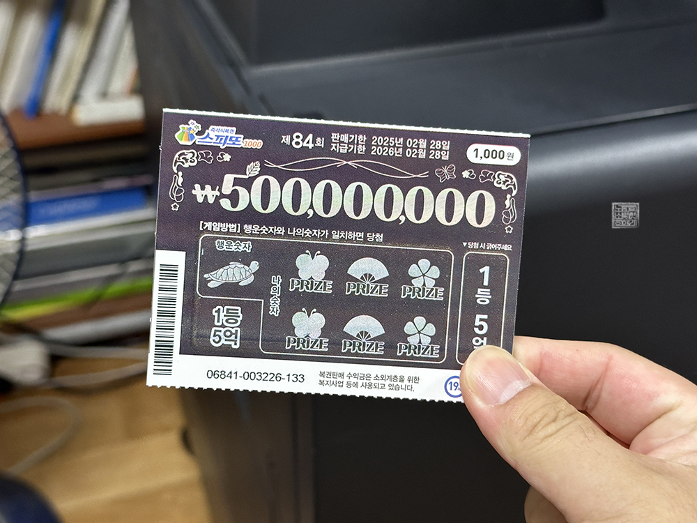 내가 즉석 복권을 구매하는 복권 판매점은 집에서 도보로 5분 거리에 있고, 지금까지 2등은 몇 번 나오기는 했어도 1등은 아직까지 나온 적이 없는 곳이다. 이제는 1등이 나올 때가 되었다고 생각하는데… 부디 매일 같이 꾸준히 복권을 구매&교환하는 내가 남아 있는 스피또1000 제84회 1등 5억 원에 당첨되었으면 하는 바람이다. (웃음)