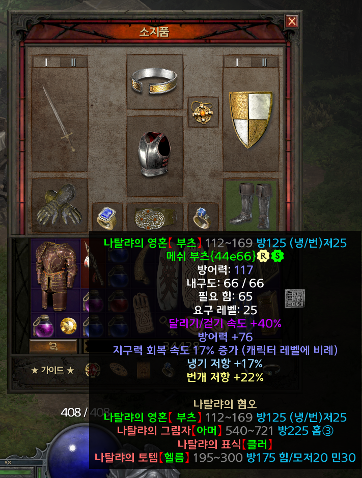 개인적으로 이번에 맨땅 어쌔신으로 플레이하면서 악몽에서 획득한 아이템 중 손에 꼽을 수 있는 좋은 아이템은 위 사진에서 볼 수 있는 나탈랴의 영혼 메쉬 부츠다. 나탈랴 세트 아이템에 해당하는 이 부츠는 달리기/걷기 속도 +40% 옵션만 아니라 초기 맨땅에서 중요한 저항도 두 가지나 최대 25까지 챙길 수 있어서 무척 유용했다.