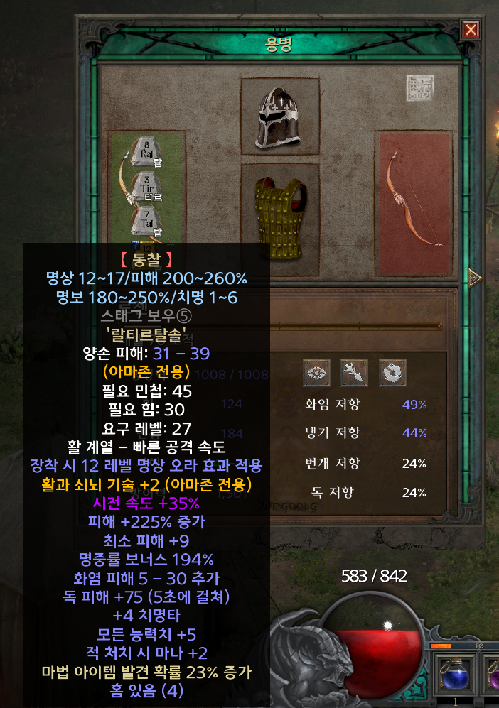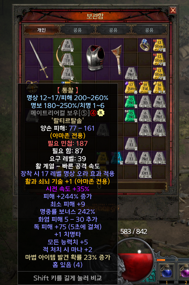 맨땅 어쌔신으로 지옥을 클리어하는 동안 제작한 통찰은 위 사진에서 볼 수 있는 두 개다. 하나는 악몽 시나리오 퀘스트를 클리어하면서 획득한 4솟 스태그보우에 만들었는데… 하필 12 레벨 명상이라 크게 효과를 볼 수가 없었다. 대신 악몽 카우에서 획득한 메이트리컬 보우에는 17 명상이 떴지만, 필요 민첩이 187로 높아서 착용을 하지 못했다.