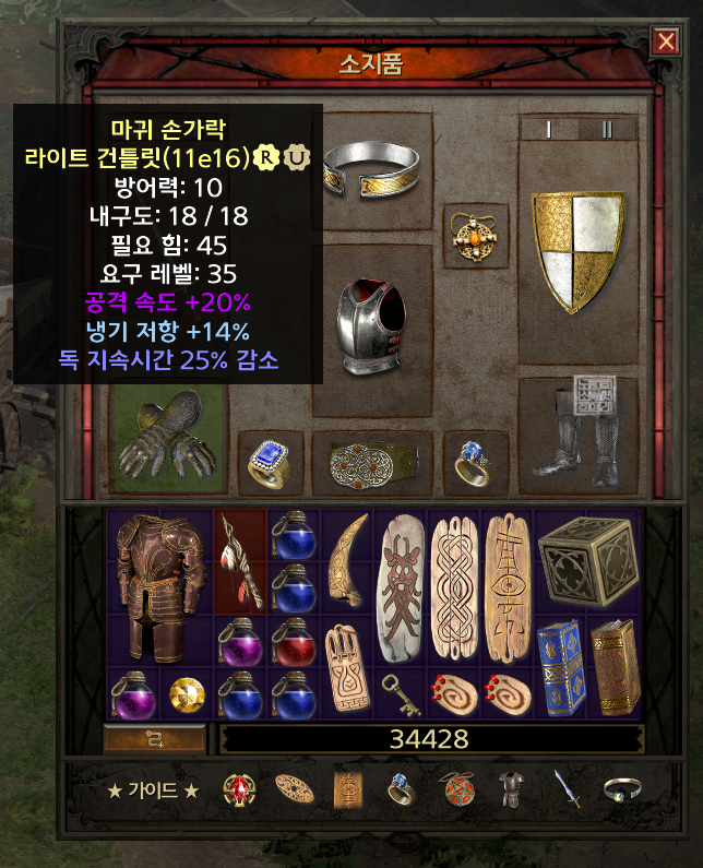 나머지는 다 고만고만한 아이템을 획득해서 착용할 수 있었는데, 어쌔신은 시전 속도보다 공격 속도가 더 중요하다 보니 장갑에 공격 속도+20%와 함께 저항 옵션이 붙어 있으면 무조건 착용해야 한다. 가장 무난하고 좋은 장갑은 지옥 난이도부터 획득할 수 있는 '고무장갑'으로 불리는 안수인데, 이 안수도 생각보다 잘 나오는 편이 아니었다.
